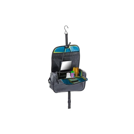 Pratico necessaire da viaggio realizzato in resistente tessuto a doppia spalmatura. Ampio scomparto principale con coperchio a cerniera e specchio infrangibile. Con gancio a scomparsa in metallo.